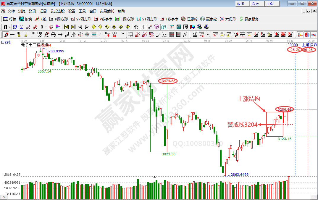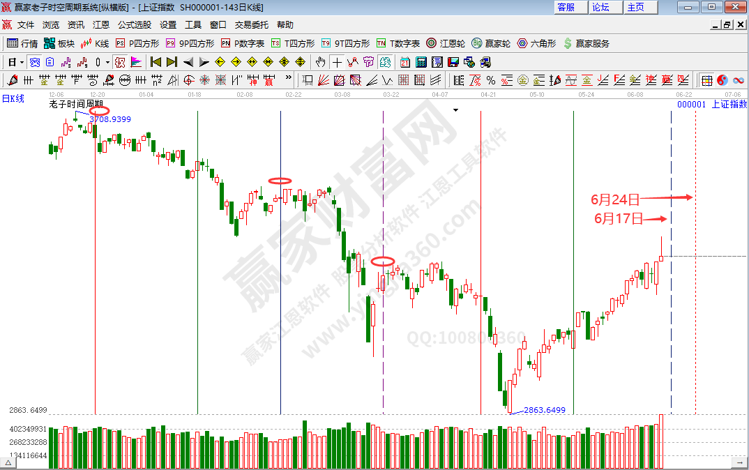 依據(jù)老子時間數(shù)列所揭示的時間密碼:滬指未來次級別時間窗口為6月17日、6月24日。