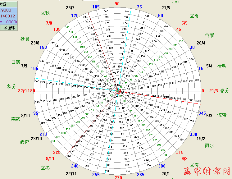 輪子中的這些數(shù)字可以是價格循環(huán),也可以是時間循環(huán)。當(dāng)市場運(yùn)行到圓周重要度數(shù)的時候,關(guān)鍵角度的數(shù)字對市場都有明確的指導(dǎo)意義。在輪子內(nèi)部可以設(shè)置三角形和四方形,如果目前市場的數(shù)字處在輪子上重要的角度出,同時三角形和四方形也給出關(guān)鍵的信號,那就要尤為注意市場的變化!