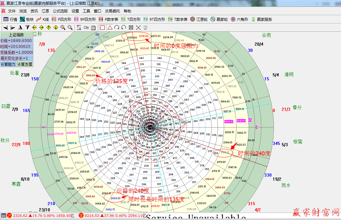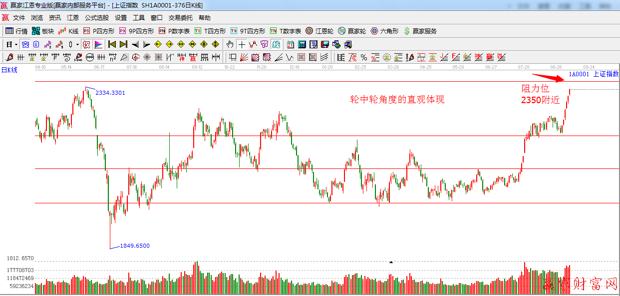 首先確定起點,我們以1849點設(shè)為價格的起點,之后打開江恩輪,點擊計算阻力,看到0度對應(yīng)1849點,時間的0度是6月25日,我們可以沿著輪種輪逆時針旋轉(zhuǎn),圓形中的三角形及四方形對應(yīng)的角度位置,都起到很重要的作用,例如,江恩的120度,135度對應(yīng)的價格是1969點,1984點,從歷史走勢中我們可以清晰的發(fā)現(xiàn),指數(shù)從2270見階段頂后一路回落,3月12日在1974點位置見階段低點,于江恩120度重要支撐提示僅僅相差5點,隨后低位箱體震蕩,對應(yīng)的上方阻力是江恩價格240度位置2089點,7月24日指數(shù)放量突破此位置,迎來了一波波瀾壯闊的行情,在時間的240度位置2187點位置少做休息之后繼續(xù)強勢走高,那么他的下一目標(biāo)位在什么位置呢,目前我們該怎么做呢?依據(jù)輪中輪分析,我們可以發(fā)現(xiàn)下一目標(biāo)位在2350點附近,2350是1984點起點的時間0點位置,此位置將是一個重要的阻力位,當(dāng)指數(shù)運行至此位置附近時投資者必須格外注意,有盈利的可以先保護一下,這樣一來自己的心里有了目標(biāo),那么操作起來就會得心應(yīng)手了。