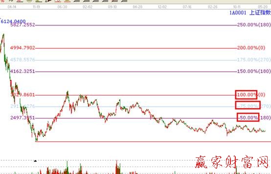 江恩認為最重要的百分比率關系是50%,50%的位置一般都是重要的支撐或者壓力,對于確定市場的強弱趨勢有很大的意義。而50%的回調對判斷市場趨勢有重要的意義。