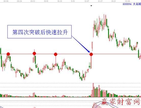 最后,我們通過一個案例,更加直接的認(rèn)識下該買賣法則的使用性。上證個股大名城(600094)該股在2012年8月-12月行情中出現(xiàn)連續(xù)三次價格達(dá)到5.75附近,這說明5.75是一個重要的阻力位,因此當(dāng)其第四次再次運行在這兒附近時,我們即可依據(jù)四次法則買入,我們可以看到該股市近期行情做的是一個箱體的橫盤震蕩,因此,我們完全可以依據(jù)K線形態(tài)做差價,依計劃在箱體底部買入,而當(dāng)股價運行至5.75附近時,由于是第四次沖擊該阻力,放心持股待漲,等待突破后快速拉升后出局。即使是第四次突破頂部后參與短線,也可以獲利近20%的收益。