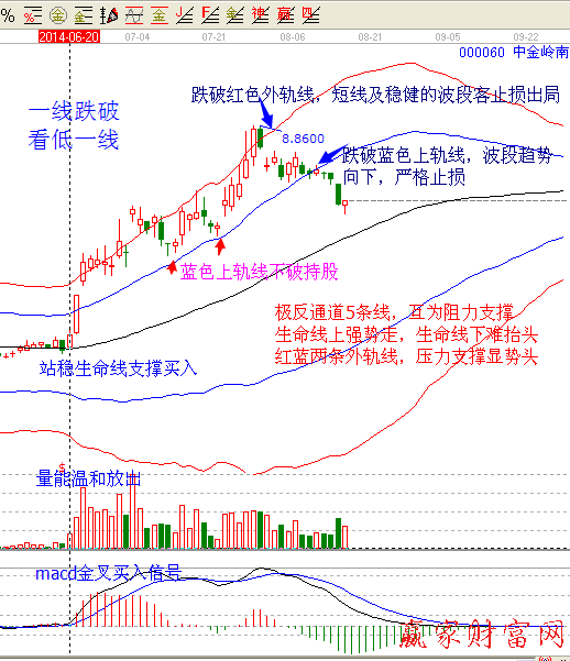 如下圖,以000060(中金嶺南)近期的走勢(shì)為例。贏家江恩極反通道工具,是用戶一致好評(píng)的經(jīng)典趨勢(shì)工具,5條線可以清晰的預(yù)判未來(lái)的阻力和支撐價(jià)位。支撐站穩(wěn),大膽買(mǎi)入持股,并以此支撐作為止損;支撐跌破堅(jiān)決走人,因?yàn)橐痪€跌破,股價(jià)大概率會(huì)跌到下面的一條線。可以看到,000060自2014.6.20號(hào)放量站穩(wěn)生命線后,一波漂亮的拉升運(yùn)行到紅色外軌線。股價(jià)走到紅色線上方時(shí),短線以紅色線作為止盈、波段以藍(lán)色線位止盈。股價(jià)兩次跌至藍(lán)色線支撐都果斷拉起,直到7.29日創(chuàng)出8.86的高點(diǎn)后,收陰線跌破紅色線——第一止損位;8.8日跌破藍(lán)色線——堅(jiān)決止損位。該股目前短期趨勢(shì)繼續(xù)下跌,先看到生命線7.3附近。如果能在第一時(shí)間止損,至少可以避免15%的虧損。即便中期看好,耐心等待回調(diào)到生命線后再介入。