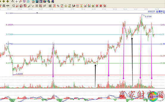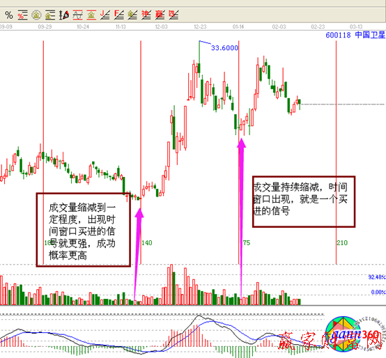 江恩認(rèn)為成交量與時間的結(jié)合就能做到預(yù)測的效果,當(dāng)成交量持續(xù)縮減或是持續(xù)放大的時候,在時間窗口出現(xiàn)的時間就可能會形成我們買進(jìn)或是賣出時間,其成功率經(jīng)過無數(shù)江恩人的實戰(zhàn)總結(jié)已經(jīng)得到驗證了。上面的600118,運用江恩的時間工具和成交量的配合,就完美的把握了兩次底部買進(jìn)時機。