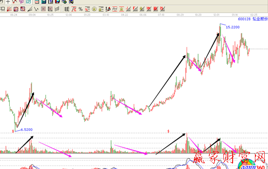 量價關(guān)系是江恩理論中的一個研究課題,價格的上漲往往是要伴隨著成交量的上漲,同樣的價格下跌也是伴隨著成交量的下跌縮小,當(dāng)價格運行至頂部的時候,成交量一般會相對前期有大的釋放,反之,下跌到底部成交量也會相對前期大幅縮小。