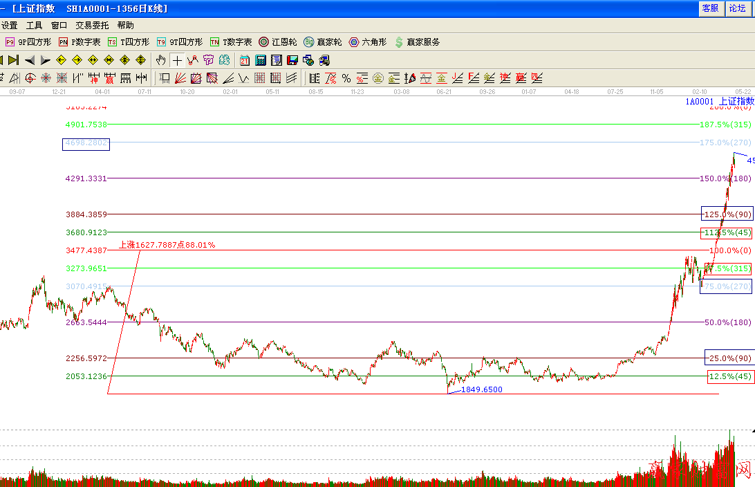 抄底、逃頂,并不難,難的是你思維,太復(fù)雜,下面我通過贏家江恩工具來展示一下江恩百分比在市場(chǎng)中的神奇作用,我只說價(jià)格,時(shí)間只需轉(zhuǎn)下思維便是了,這要靠你自己的悟性了,別人說出來的,你永遠(yuǎn)不可能深層次的理解。同一種顏色方框,代表的是同一條線,起到同樣的周期意義,(研究歷史預(yù)測(cè)未來)。這就是百分比的循環(huán)周期,點(diǎn)到為止,如過思考三遍還不理解,而且還想學(xué)習(xí)的,聯(lián)系客服吧,對(duì)了通過工具得出上證指數(shù)目前下一個(gè)目標(biāo)位是4700點(diǎn)附近.整體向好趨勢(shì)還在。