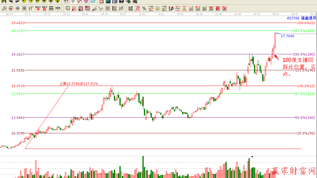 江恩180度位置,(支撐和阻力是可以相互轉(zhuǎn)換的),5月18日這天股價放量突破了江恩180度24.16元,次日回踩支撐位置,今日放量拉升,股價的每一個波動都在