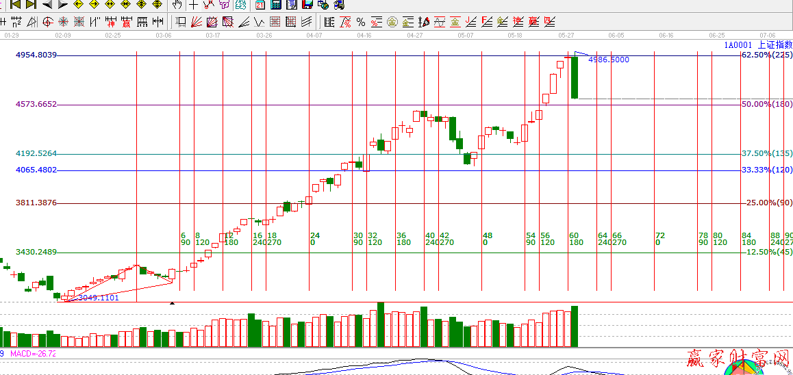 再看當(dāng)前指數(shù)的位置,指數(shù)在27號(hào)拉升至百分比62.50%的位置時(shí),剛好出現(xiàn)時(shí)間窗口,到28號(hào)指數(shù)沒有有效突破壓力位置,且前一天已經(jīng)是時(shí)間窗口了,會(huì)看江恩理論的分析的投資者在這個(gè)位置肯定是要做減倉(cāng)或是出局的動(dòng)作的,這也再次驗(yàn)證了江恩工具對(duì)大盤指數(shù)或是個(gè)股的準(zhǔn)確分析。