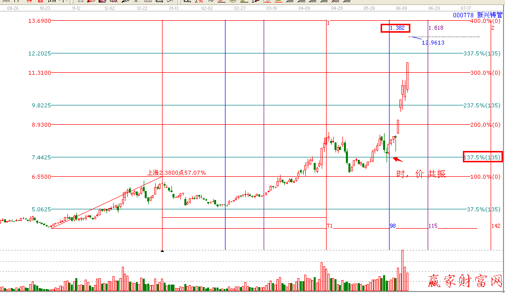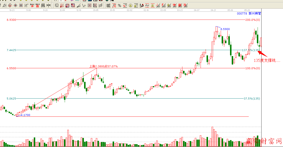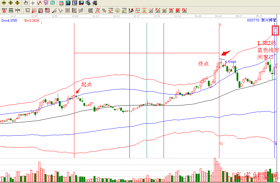 時(shí)間是決定市場走勢的最重要因素,時(shí)間存在著循環(huán)周期,價(jià)格呢,價(jià)格是時(shí)間的另外一種展現(xiàn)形式,里面依然存在這循環(huán)周期,既然時(shí)間,價(jià)格上都存在這循環(huán)周期,那么未來的時(shí)間和價(jià)格也就必定可以預(yù)測了,你會相信了這個(gè)市場有規(guī)律可言。今天我拿000778【新興鑄管】,這票來詳細(xì)講解一下,