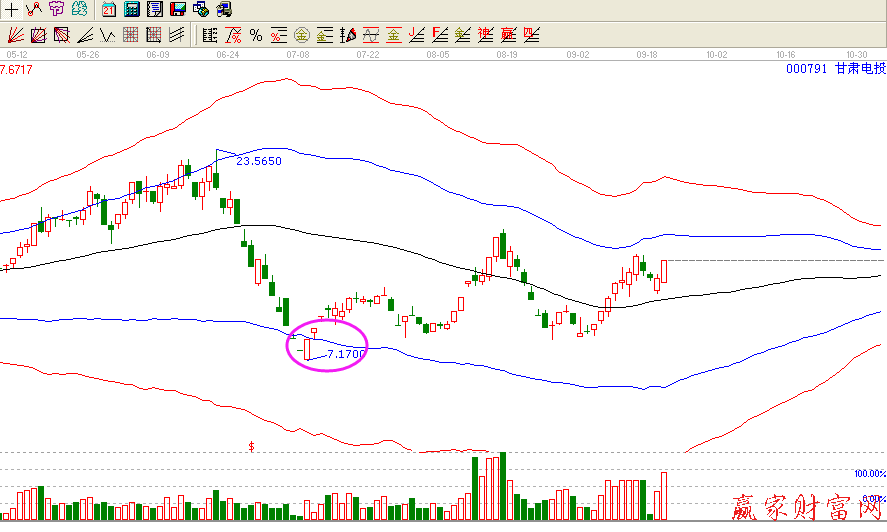 極反通道,其原理就是物極必反,即極則必反,全則必缺。000791從高點(diǎn)23.565下跌至極反通道的弱勢(shì)藍(lán)色下軌線位置,已經(jīng)是運(yùn)行到了一個(gè)極致的位置,按照物極必反的原理,這個(gè)位置必定有一波反彈行情,趨勢(shì)上確認(rèn)了未來(lái)的上漲行情,因此在藍(lán)色上軌線位置就是一個(gè)波段建倉(cāng)的位置。