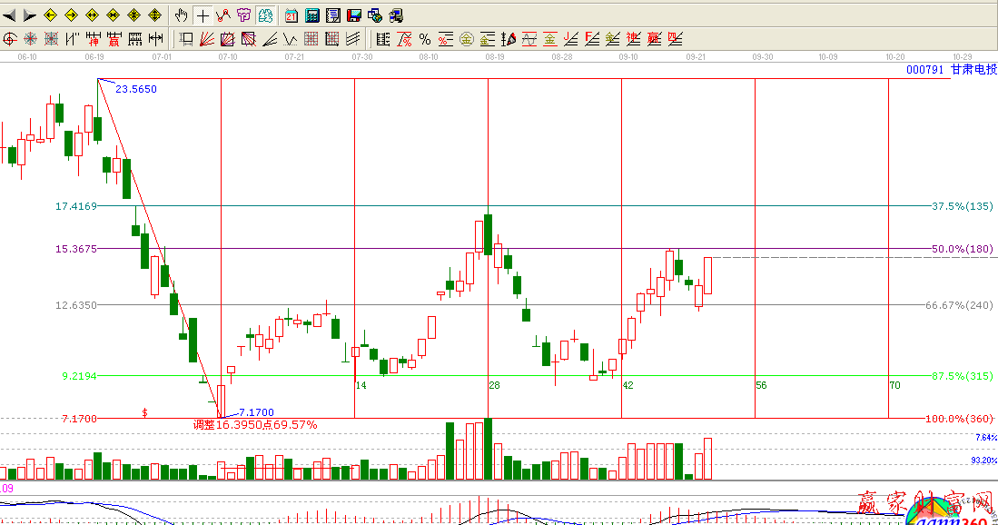 在江恩理論中,分析市場(chǎng)通過(guò)趨勢(shì),時(shí)間和價(jià)格去分析個(gè)股,首先我們要去看趨勢(shì),如果趨勢(shì)符合操作條件,且在未來(lái)的一段時(shí)間內(nèi)有上漲空間,我們就可以選擇操作,然后我們?cè)俳Y(jié)合江恩的時(shí)間分析工具和價(jià)格分析工具去把握個(gè)股中間的波動(dòng),差價(jià)來(lái)回就能更穩(wěn)的盈利。下面我們以000791為例,展示一下如何利用江恩理論的時(shí)價(jià)共振做波段。