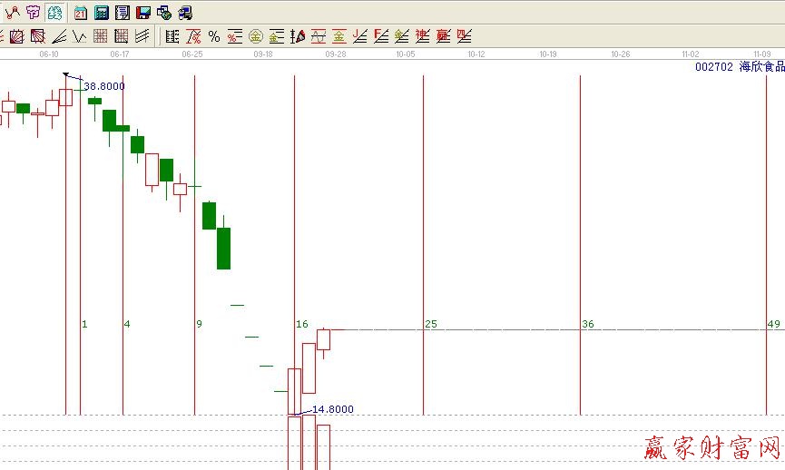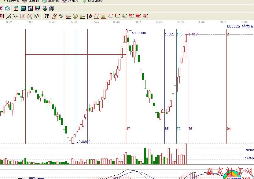 先講時(shí)間周期,江恩使用各種各樣的時(shí)間工具去研究個(gè)股頂部和底部之間的時(shí)間關(guān)系。通常情況下,我們多用黃金時(shí)間周期線、費(fèi)氏時(shí)間循環(huán)線、平方時(shí)間循環(huán)線等等來判斷個(gè)股的時(shí)間窗口,找到介入或是出局的時(shí)機(jī)。