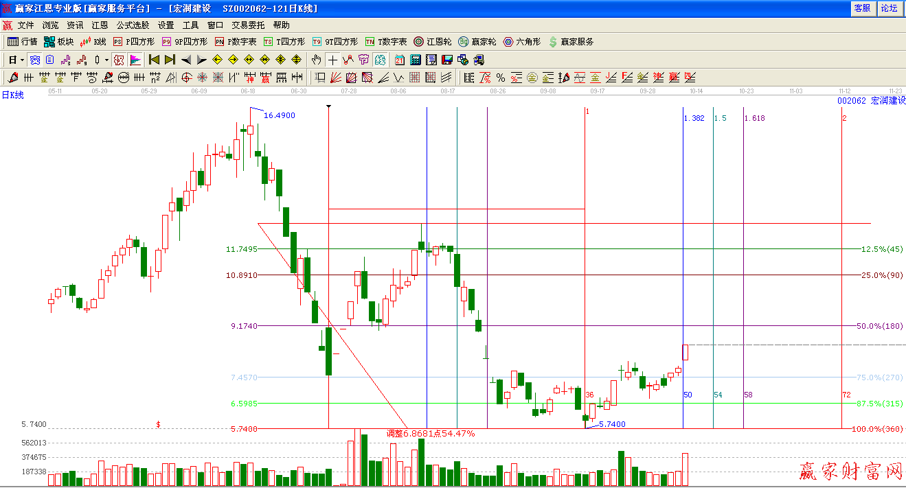為什么這個(gè)股會(huì)漲停?我相信這是每一個(gè)投資者最想知道的!今天我們就來(lái)解決一下這個(gè)問(wèn)題,我始終堅(jiān)信這個(gè)市場(chǎng)中存在著自然規(guī)律,而江恩理論是闡述股價(jià)波動(dòng)規(guī)律的一套理論,江恩理論源自自然法則,自然循環(huán)。江恩老先生曾經(jīng)講到,“共振”是使股價(jià)產(chǎn)生大幅波動(dòng)的重要因素,共振是一種合力,在同一時(shí)間,多種力量集合并且向同一方向推動(dòng)的力量就是共振的力量。是引起股價(jià)大幅波動(dòng)的重要因素,所以如果我們一旦把握到這個(gè)點(diǎn),你將會(huì)獲得巨大的利潤(rùn)或者規(guī)避巨大的風(fēng)險(xiǎn)。下面我們來(lái)共同探討一下002062【宏潤(rùn)建設(shè)】。