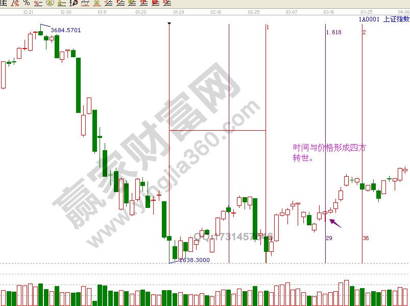 為什么在日線和周線或者月線上,股票的價格會穿越45度角,隨后出現(xiàn)一輪時間的上升,之后又下跌并停留在45度線上方,因為當該股第一次穿越45度角度線時,它沒有超越時間上的四方,當它在次級回調(diào)中停在該45度角線上時,該股就在時間上到達了與價格的四方形,在這之后,將出現(xiàn)一輪更大的下跌。
