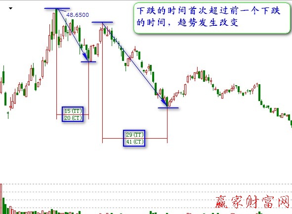 ?、偃绻囝^已經(jīng)上漲了很長(zhǎng)一段時(shí)間,那么當(dāng)某個(gè)下跌的時(shí)間首次超過(guò)前一個(gè)下跌的時(shí)間,就表明趨勢(shì)正在改變,至少是暫時(shí)地改變。