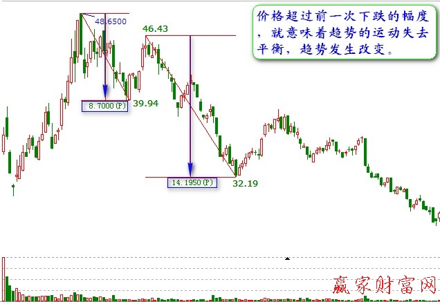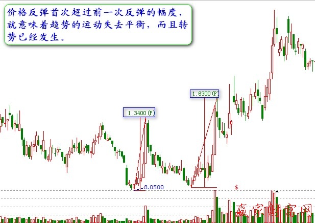 ②如果價(jià)格反彈首次超過(guò)前一次反彈的幅度,就意味著趨勢(shì)的運(yùn)動(dòng)失去平衡,而且轉(zhuǎn)勢(shì)已經(jīng)發(fā)生。