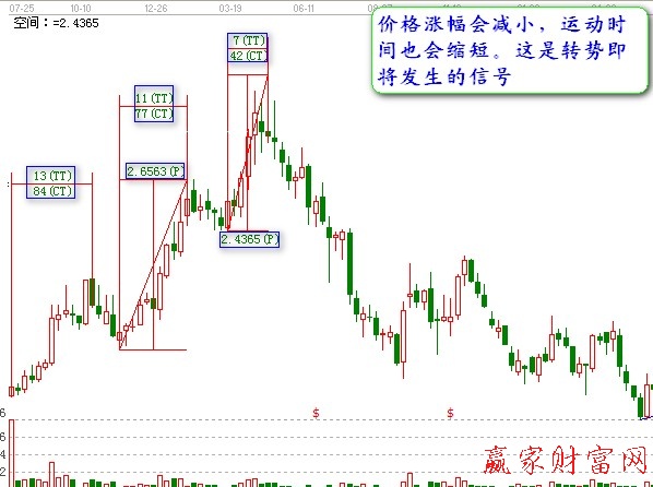 ?、郛?dāng)市場(chǎng)正在接近一段時(shí)期上漲或下跌的終點(diǎn),而且到達(dá)每三段或每四段時(shí),相比前一段的市場(chǎng)運(yùn)動(dòng),價(jià)格漲幅會(huì)減小,運(yùn)動(dòng)時(shí)間也會(huì)縮短。這是轉(zhuǎn)勢(shì)即將發(fā)生的信號(hào)。