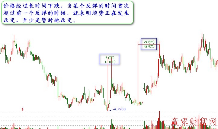 ①如果價(jià)格已經(jīng)下跌了很長(zhǎng)一段時(shí)間,那么當(dāng)某個(gè)反彈的時(shí)間首次超過(guò)前一個(gè)反彈的時(shí)候,就表明趨勢(shì)正在發(fā)生改變,至少是暫時(shí)地改變。