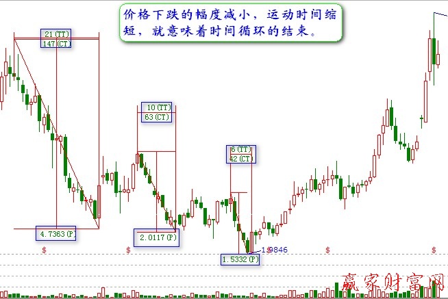 ③在空頭的末期,相比前一段的市場(chǎng)運(yùn)動(dòng),如果價(jià)格下跌的幅度減小,運(yùn)動(dòng)時(shí)間縮短,就意味著時(shí)間循環(huán)即將結(jié)束。