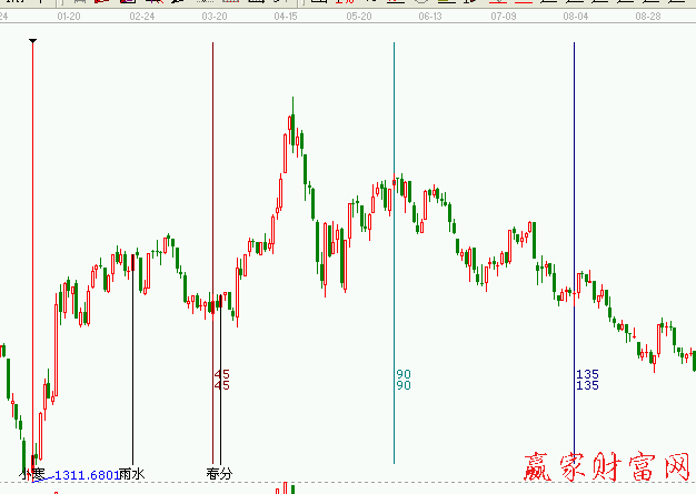 對于時間的分析源自并基于地球的自轉(zhuǎn)和公轉(zhuǎn)。地球的公轉(zhuǎn)形成了春夏秋冬四季的變化,所以江恩尤為注意氣候的變化。他認為1月2日至7日以及15日至21日,7月3日至7日以及25日至27日要特別留意。從天文學角度來看,1月5日是近日點,地球公轉(zhuǎn)速度最快,7月5日為遠日點,地球公轉(zhuǎn)速度最慢。提到季節(jié)性周期中,不得不說我國的24節(jié)氣。其中1月20日為大寒,7月23日為大暑,是一年中氣溫最極端的日子,極易發(fā)生轉(zhuǎn)勢,江恩的季節(jié)性周期與中國歷法中的廿四節(jié)氣不謀而合。贏家江恩軟件中的24節(jié)氣工具,更是可以直觀的顯示出節(jié)氣的變盤,如下圖: