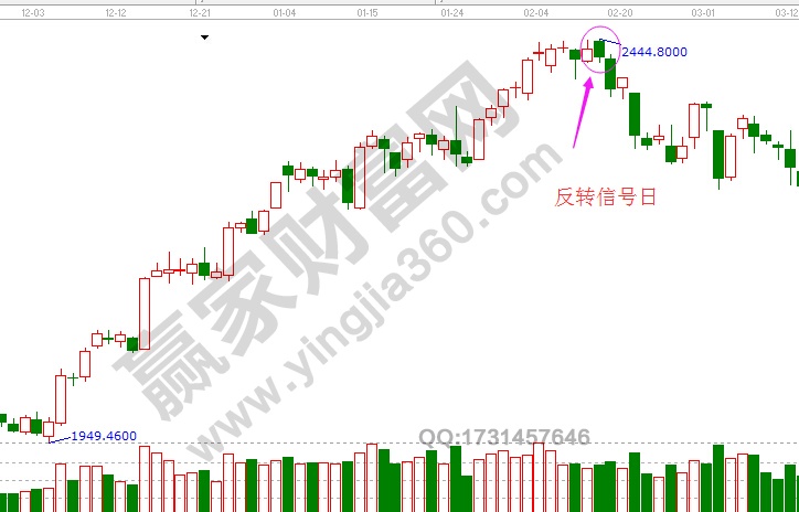 反轉日的意思是,當天的價格開市時比上以交易日高位高,并創(chuàng)出新高,隨后回落,并以全日最低位收盤。(如下圖)