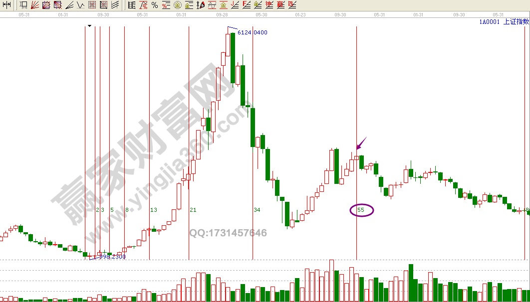 從998點(diǎn)開始向上數(shù)一個(gè)斐波那契數(shù)列,如圖紅色數(shù)字標(biāo)注,到55的時(shí)候正好是2009年12月,也就是3478點(diǎn)的次高點(diǎn)位置,新一輪熊市啟動(dòng)的地方。