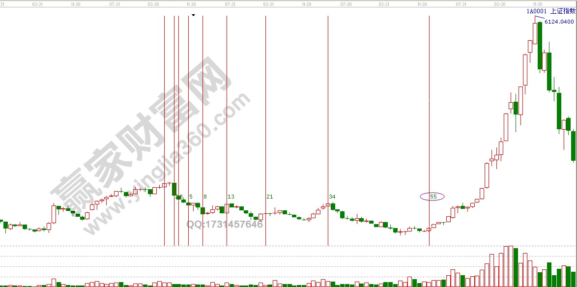 隨后再從3478點(diǎn)向下數(shù)一個(gè)斐波那契數(shù)列,如圖藍(lán)色數(shù)字標(biāo)注,55對應(yīng)的位置正好又是指數(shù)即將啟動(dòng)的地方。同理,當(dāng)前從1849點(diǎn)向上數(shù)一個(gè)斐波那契數(shù)列,以此類推,本次只是用指數(shù)月線圖給大家演示了一種最簡單的使用方法,后期還會(huì)持續(xù)給大家講解更加實(shí)戰(zhàn)的使用技巧。