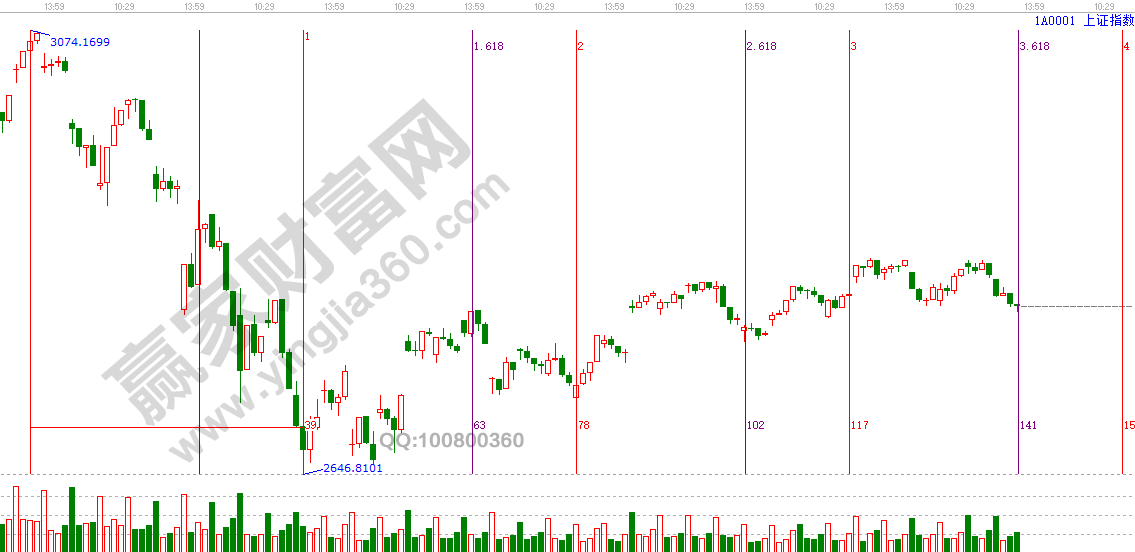 3.和諧:幾乎在所有的熙然和經濟出局中都存在和諧現象。一個循環(huán)可以包含若干個小周期,也就是江恩理論中講的循環(huán)中的循環(huán)。比如,將54年循環(huán)分割成6個9年循環(huán),而每一個9年循環(huán)又可以分成3個3年循環(huán)。循環(huán)可以一直分割下去,之中發(fā)現最短最可靠的循環(huán)周期。當然這種說的是一種很極端的等分方式,大多數情況下,循環(huán)的和諧會以其他的方式出現,比如圖2黃金分割比率