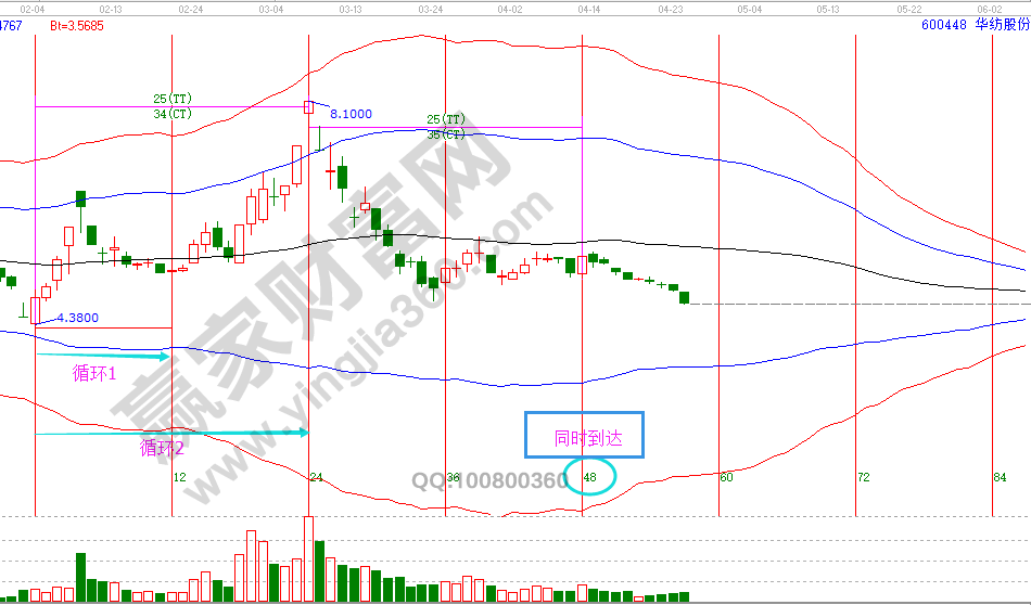 8.群聚:有時候不同長度的循環(huán)在同一個時間到達高點或是低點,這就是群聚。如圖形3,不同的兩個循環(huán)長度1和循環(huán)長度2,在同一個時間達到48的循環(huán)位置。如圖3