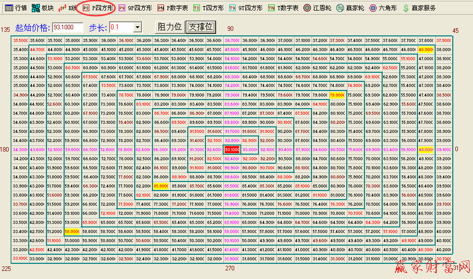 對(duì)于能看懂四方形圖表工具的投資者來講,四方形是一個(gè)很有投資指導(dǎo)意義的工具,但就像上面講的,因?yàn)椴荒芎蚄線想結(jié)合,也還是會(huì)有一些不便,而對(duì)于沒有接觸過江恩理論的朋友來講,看這個(gè)圖形更是難以理解,太過于復(fù)雜,想要學(xué)習(xí)也會(huì)無從下手,因此贏家江恩借助價(jià)格四方形的原理及原有循環(huán)排列方式,優(yōu)化改進(jìn)出了