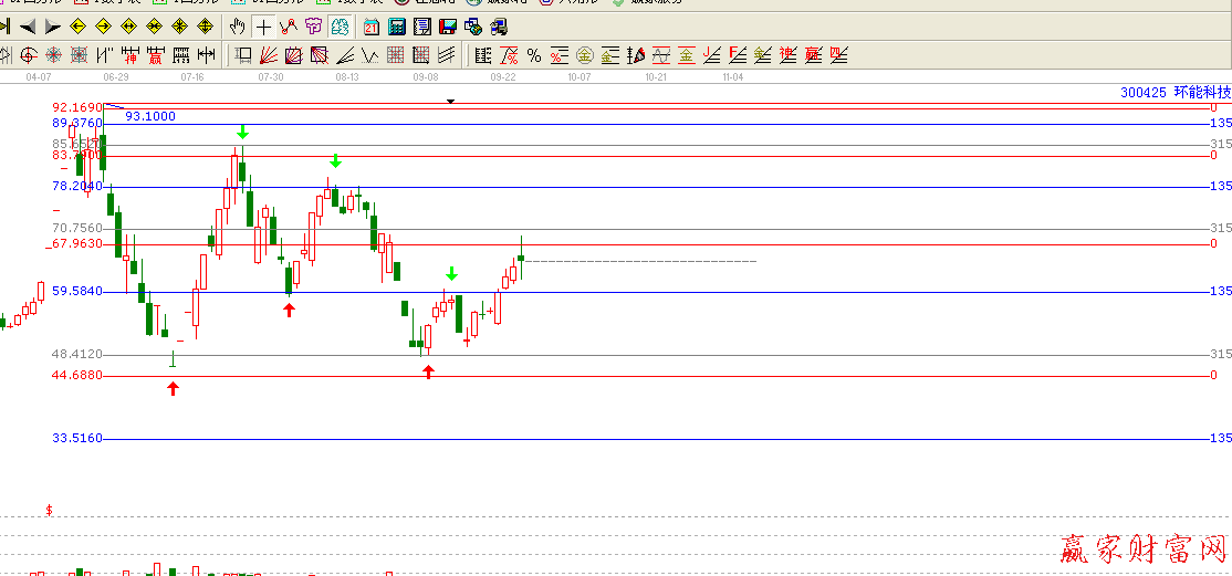 我們以個(gè)股300425為例先看江恩的原始價(jià)格四方形圖表。因?yàn)榻鞯脑紙D表工具不能和K線圖形進(jìn)行相結(jié)合,我們需要對(duì)照K線圖形來看價(jià)格四方形的圖表,我們知道,四方形上的數(shù)字雖多,但是比較重要的位置在米字線上,也就是當(dāng)價(jià)格運(yùn)行至米字線的時(shí)候,趨勢(shì)很有可能發(fā)生轉(zhuǎn)變,我們結(jié)合K線圖可以發(fā)現(xiàn),300425從高點(diǎn)93.30回調(diào)之后,重要的頂部和底部位置基本上都是在四方形的米字線附近形成的。