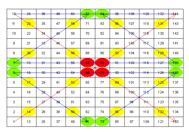 4、1/4大小的正方形中心的對角線,它所經(jīng)過的這些數(shù)字是次強(qiáng)的。這些數(shù)字是7,20,33,46,59,72,和 61,50,39,28,17和6。在正方形的另一邊的1/4上的數(shù)字是73,86,99,112,125,138,和 139,128,117,106,95和84。