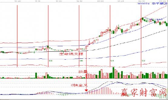 “0軸第一次金叉”,macd突破0軸之后形成的第一個金叉,往往是市場中3浪的啟動點,結(jié)合贏家極反通道生命線支撐,完美的配合后,是一種相當(dāng)穩(wěn)健的方法。