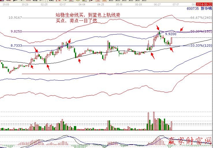 極反通道加上江恩百分比的圖。從圖中我們可以很清楚的看出買賣點。在生命線附近都是買點,只要你把握住,站穩(wěn)了生命線買入,上方目標都可以看到藍色上軌線。從圖中可以看出,一波上漲之后回調(diào),接著繼續(xù)上漲,很好的一個波段個股,很適合平時工作忙的人來操作的,一旦介入這樣的個股,就設(shè)好止損位,等待上漲到目標位就好了。