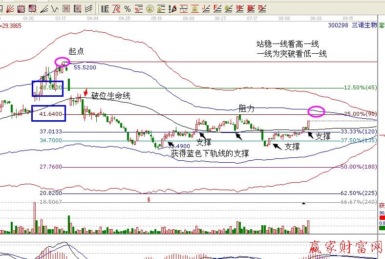 江恩價(jià)格百分比,選擇55.52元這個(gè)歷史最高點(diǎn)為起點(diǎn)作圖來分析該股的支撐阻力位。股價(jià)在線上就是支撐,股價(jià)在線下就是阻力,通過觀察可以發(fā)現(xiàn)該股只有在37.50%(34.70元)以及33.33%(股價(jià)是37.01元)的百分比線上獲得支撐,那么,支撐不破就是買點(diǎn),也就是說這兩個(gè)股價(jià)的百分比價(jià)格附近是可以來操作的。如果你在這連個(gè)價(jià)格買入了,那么就站穩(wěn)一線,看高一線,給自己做一個(gè)簡單的計(jì)劃即可。