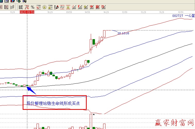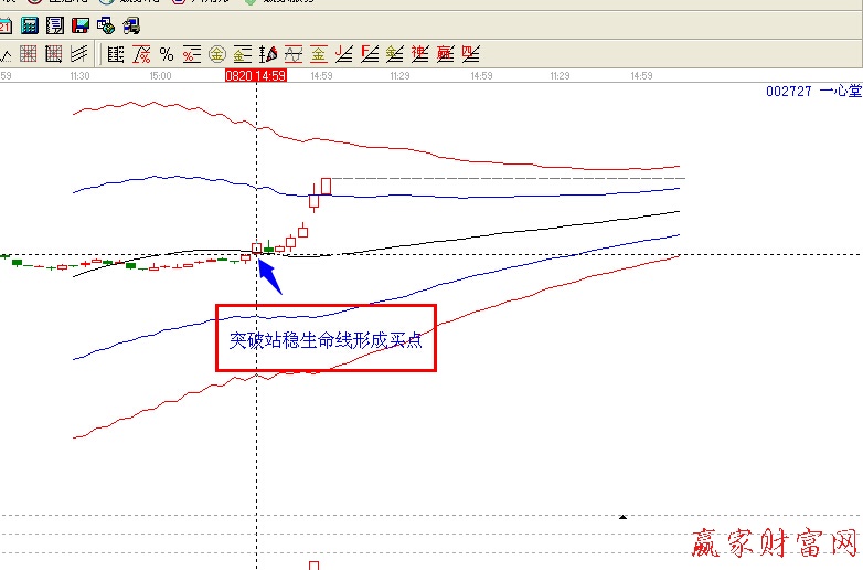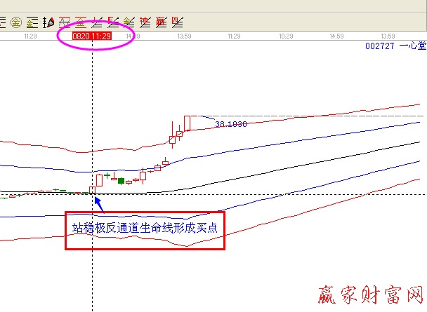 極反通道,我們可以看到股價(jià)在2014年8月20號下午盤股價(jià)突破站穩(wěn)生命線位置,形成了短線買點(diǎn)。