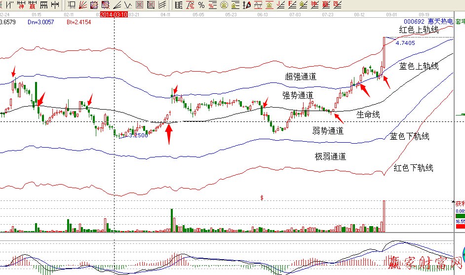 下面通過(guò)000692的極反通道圖給大家詳細(xì)的介紹下:在圖中你可以看到五條線分為了四個(gè)通道,分別是強(qiáng)勢(shì)通道、超強(qiáng)通道、弱勢(shì)通道、極弱通道,按照規(guī)則,我們只做在生命線以上的個(gè)股,從圖中可以看出,只要站上生命線,去操作,同時(shí)做好交易計(jì)劃,基本上都不會(huì)虧錢(qián)的(阻力未突破回踩破位的不算,因?yàn)閺纳€上去,遇到藍(lán)色上軌線的阻力過(guò)不去回調(diào)就是休息的時(shí)候)。你只需按照站穩(wěn)一線,看高一線,跌破一線看低一線的原則去做計(jì)劃就可以。