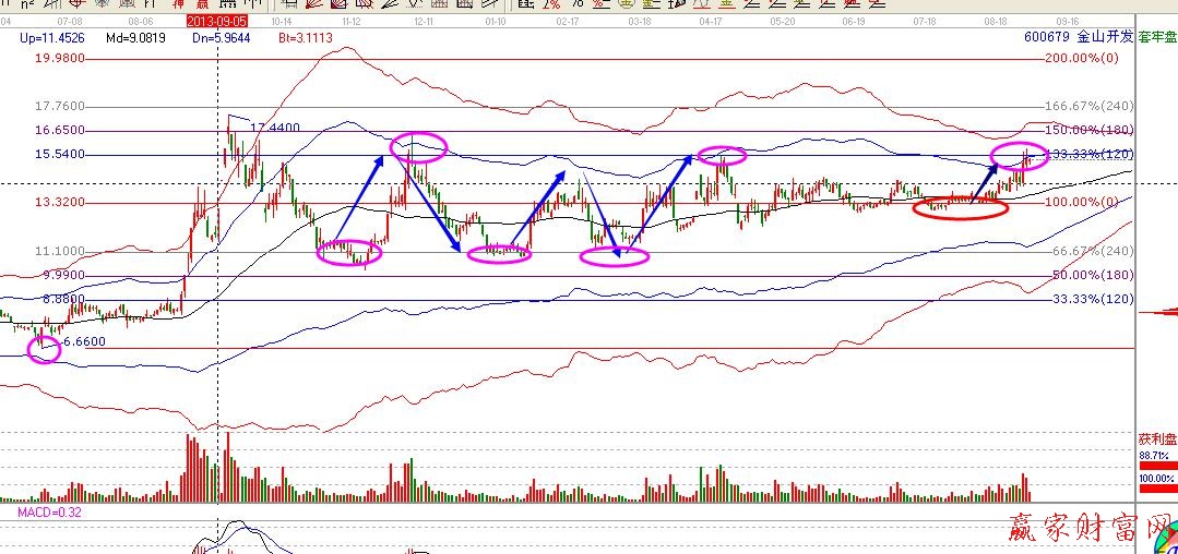百分比選擇的是6.66元這個(gè)低點(diǎn)為起點(diǎn)做百分比圖,從圖中我們可以看出股價(jià)在百分比133.33%的位置價(jià)格是15.54元附近,有兩次都沒(méi)有突破過(guò)去,都是到了這個(gè)位置附近,正好和極反通道的藍(lán)色上軌線重合了基本上,兩次都是在該位置向下回調(diào),尋找支撐了。如果你在第一次的時(shí)候發(fā)現(xiàn)了這個(gè)規(guī)律,那么在第二次股價(jià)又從66.67%這個(gè)位置漲上去的時(shí)候你就會(huì)在15.54元附近的時(shí)候獲利了吧。