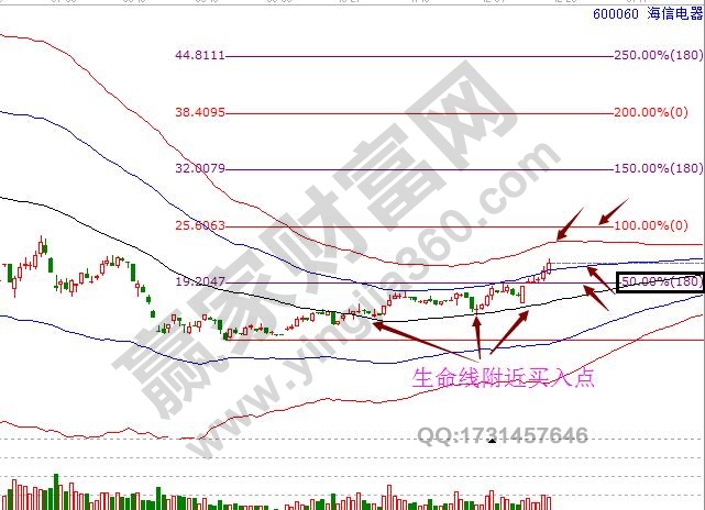趨勢(shì)及價(jià)格:從極反通道來看,海信電器近期給的操作機(jī)會(huì)是很多的,三次回踩生命線,都是建倉的位置,如果長(zhǎng)期有關(guān)注的話,相信這幾個(gè)買點(diǎn)應(yīng)該是可以把握的。而當(dāng)前市場(chǎng)已經(jīng)突破藍(lán)色外軌線,進(jìn)入超強(qiáng)通道,趨勢(shì)上是符合買入條件的。同時(shí),市場(chǎng)短期的成交量也配合的不錯(cuò),因此,按照極反通道操作規(guī)則,藍(lán)色線附近是可以考慮建倉的。價(jià)格上來看,從低位做出向上的江恩價(jià)格百分比,同時(shí)保留50%位置,可以看到市場(chǎng)前期一直受阻于該位置,12月15日市場(chǎng)放量跳空突破,50%位置轉(zhuǎn)換為支撐,同樣,按照價(jià)格買賣,此位置附近也是一個(gè)買入位,其重要阻力位就是上面的0度位置。