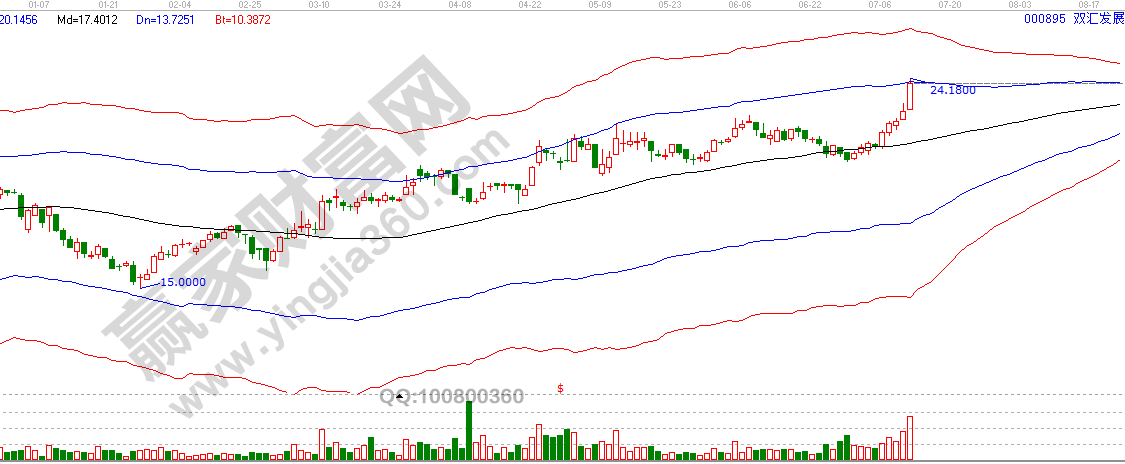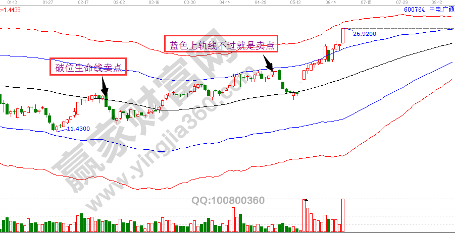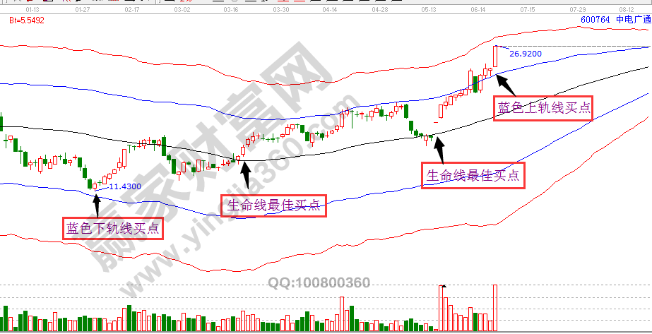 同樣利用極反通道我們就可以很完美的判斷買點(diǎn)以及上漲空間。在極反通道中,有三個(gè)買點(diǎn)位置,站穩(wěn)生命線就是最佳的買點(diǎn)位置,突破站穩(wěn)到藍(lán)色上軌線,就是第二買點(diǎn),或者是回踩到藍(lán)色下軌線位置,是超跌的買點(diǎn)。利用極反通道的操作規(guī)則,站穩(wěn)一線看高一線,跌破一下看低一線,在生命線買進(jìn)之后,目標(biāo)位就是藍(lán)色上軌線位置,跌破生命線,則下跌目標(biāo)位是藍(lán)色下軌線位置。