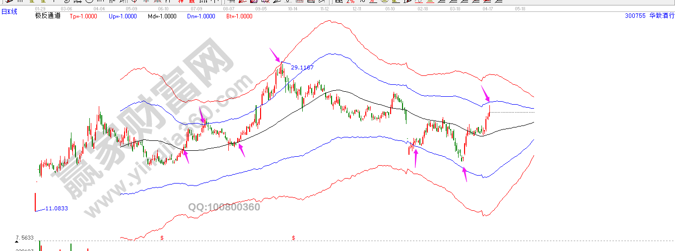 在上面華致酒行的圖形中,所有的波動(dòng),都存在于極反通道五條線四個(gè)通道之內(nèi)。極反通道前一個(gè)月日線中沒有極反通道出現(xiàn),在江恩理論中講研究歷史預(yù)測未來,我們需要通過一個(gè)月的數(shù)據(jù)搜集和計(jì)算,找到個(gè)股的波動(dòng),然后去生成極反通道圖形。每一個(gè)通道都可以是一個(gè)循環(huán)的起點(diǎn)和終點(diǎn),而四條通道又可以看做是一個(gè)大循環(huán)的起點(diǎn)和終點(diǎn),在大循環(huán)中有小循環(huán),從生命線(中間黑色曲線)開始,向上到藍(lán)色上軌線,可以看做是一個(gè)小的空間循環(huán)起始位置,在實(shí)戰(zhàn)常規(guī)運(yùn)用中,生命線就是一個(gè)最佳的起爆點(diǎn),而藍(lán)色上軌線,則是常規(guī)的賣點(diǎn)位置。當(dāng)個(gè)股下跌方向,藍(lán)色下軌線就是第一個(gè)極限空間位置,當(dāng)?shù)竭_(dá)這個(gè)位置就會上漲,這個(gè)點(diǎn)位的交易就可以對標(biāo)散戶期待的抄底交易。而紅色上軌線是一個(gè)通道的極限上漲空間位置。因此大多數(shù)的個(gè)股在到達(dá)這個(gè)極限之后就是一波上漲結(jié)束的最終位置。知道“極”在哪里,才能對應(yīng)做交易。
