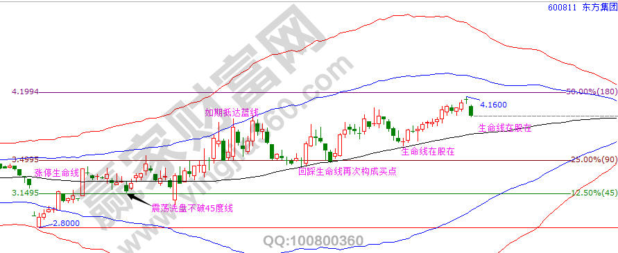 其次,謹(jǐn)記——“生命線在,股在”。低吸入場(chǎng)的股票,要有持股條件,未擊穿止損位應(yīng)耐心持股。在生命線附近低吸的個(gè)股,從進(jìn)場(chǎng)就要明白預(yù)期上漲空間是藍(lán)色上軌線,只要不破生命線就有去藍(lán)線的機(jī)會(huì),那么,生命線在股在。這里注意一點(diǎn),有部分個(gè)股會(huì)圍繞生命線上下幾個(gè)點(diǎn)震蕩修復(fù),此類個(gè)股可以結(jié)合江恩百分比來(lái)確認(rèn)止損位,不破百分比線均可視為生命線處正常整理,當(dāng)時(shí)間到達(dá),一樣會(huì)給出到藍(lán)線的機(jī)會(huì)。(如圖600811東方集團(tuán))