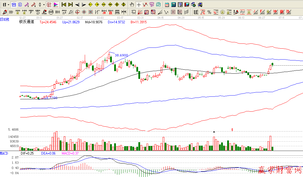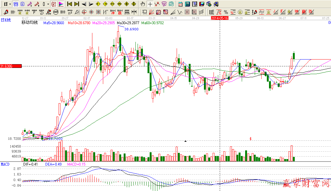 極反通道來(lái)分析一下該股目前狀況。如下圖所示,該股前期一直在生命線下運(yùn)行,生命線下運(yùn)行形勢(shì)較弱,成交量萎縮配合走勢(shì)。隨后股價(jià)走出一個(gè)短期的低點(diǎn)之后在生命線附近徘徊,突破生命線的阻力變?yōu)橹尉€。一直到2014年7月2日,如下圖所示,在生命線附近拉起陽(yáng)線,一舉突破生命線的壓制,站穩(wěn)生命線,緊接著今天股價(jià)繼續(xù)放出短期內(nèi)的巨量,之后股價(jià)開始拉升,成交量配合下在生命線上強(qiáng)勢(shì)運(yùn)行。根據(jù)該股形態(tài),以及贏家江恩工具的操作策略,站穩(wěn)一線看高一線,股價(jià)的上漲空間已經(jīng)打開,該股隨后會(huì)創(chuàng)下新高。