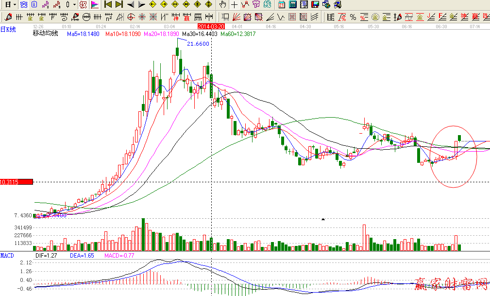 如果覺得上圖指標(biāo)還不充分,接下來我們來用均線趨勢指標(biāo)來驗證一下。如下圖所示,該股處于相對的底部,在漲停前經(jīng)歷了一段時間的震蕩,隨后均線出現(xiàn)金叉,一陽穿多線形態(tài)出現(xiàn),目前發(fā)散向上,該股后市會有慣性向上的上漲。