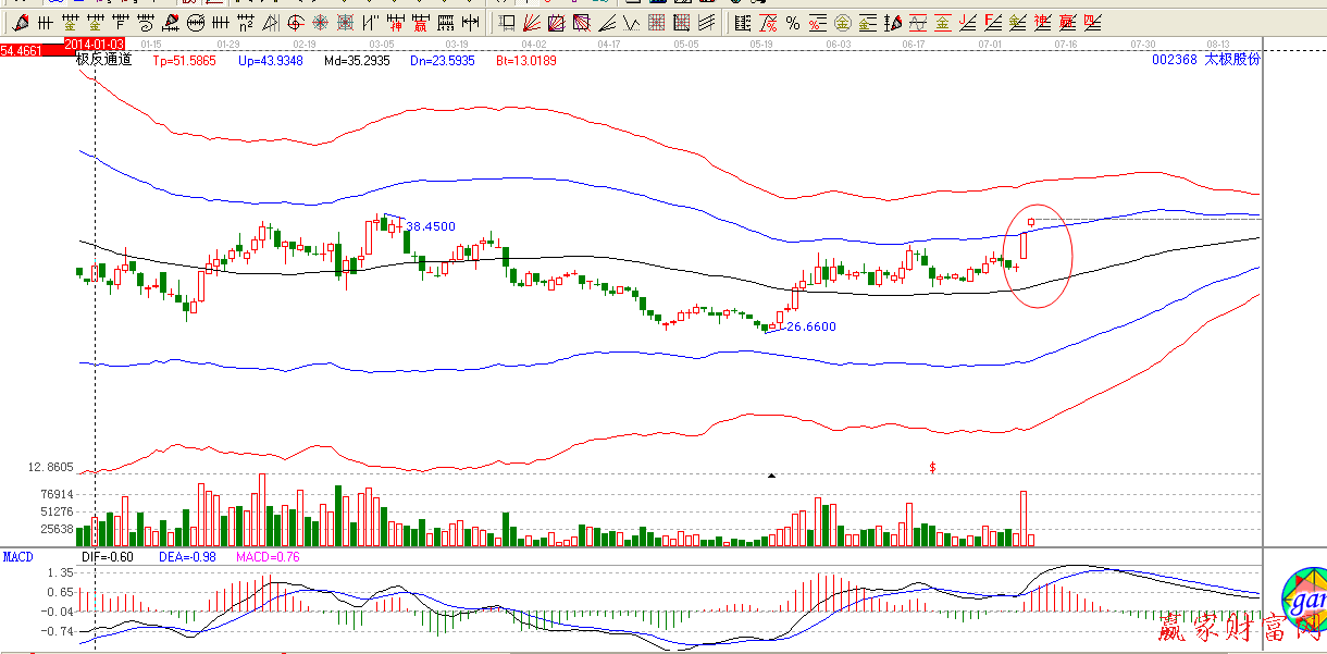 極反通道來分析一下該股目前狀況。如下圖所示,該股前期一直在生命線上運行,生命線上運行形勢較弱,成交量萎縮配合走勢。出現(xiàn)漲停大陽線拉升之后,股價突破強勢外軌線,漲勢打開,上漲趨勢明顯。此次拉升變強勢外軌線壓力為支撐力。緊接著該股放量漲停。目前該股徘徊在強勢外軌線上方整理,站穩(wěn)之后看向超強外軌線,隨后會創(chuàng)下新高。