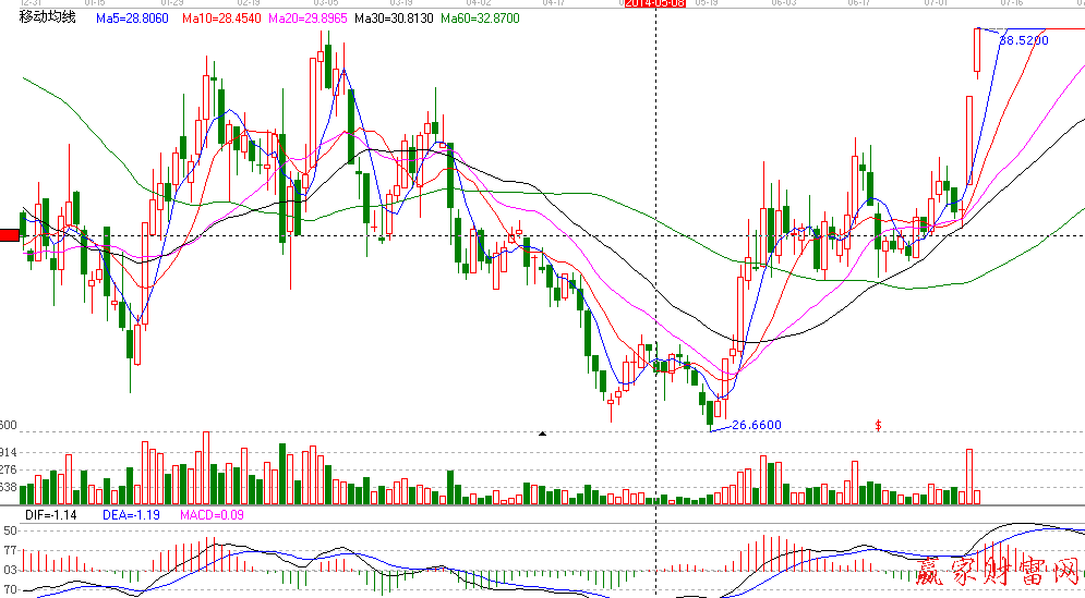 如果覺得上圖指標還不充分,接下來我們來用均線趨勢指標來驗證一下。如下圖所示,該股現(xiàn)在處于拉升的中途,前期到達一個底部之后低點是26.6元,之后均線呈現(xiàn)多頭排列,上升一段時間之后橫盤震蕩,橫盤大概經(jīng)歷半個月時間,一直站穩(wěn)30日線,之后出現(xiàn)一陽穿多線的形態(tài)站穩(wěn)各條均線,上漲慣性會持續(xù)一段時間。