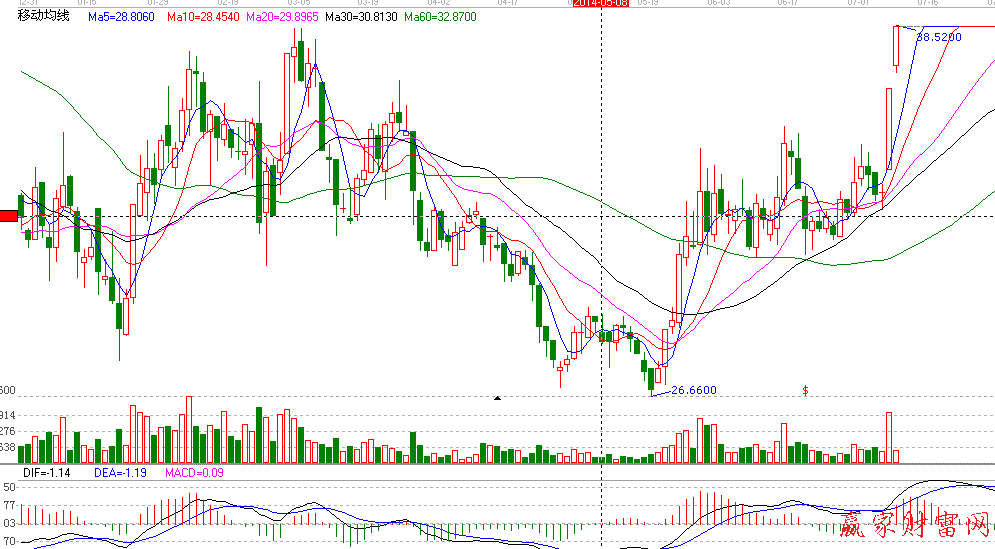 如果覺得上圖指標(biāo)還不充分,接下來我們來用均線趨勢指標(biāo)來驗(yàn)證一下。如下圖所示,該股現(xiàn)在處于拉升的中途,前期到達(dá)一個(gè)底部之后低點(diǎn)是26.6元,之后均線呈現(xiàn)多頭排列,上升一段時(shí)間之后橫盤震蕩,橫盤大概經(jīng)歷半個(gè)月時(shí)間,一直站穩(wěn)30日線,之后出現(xiàn)一陽穿多線的形態(tài)站穩(wěn)各條均線,上漲慣性會(huì)持續(xù)一段時(shí)間。