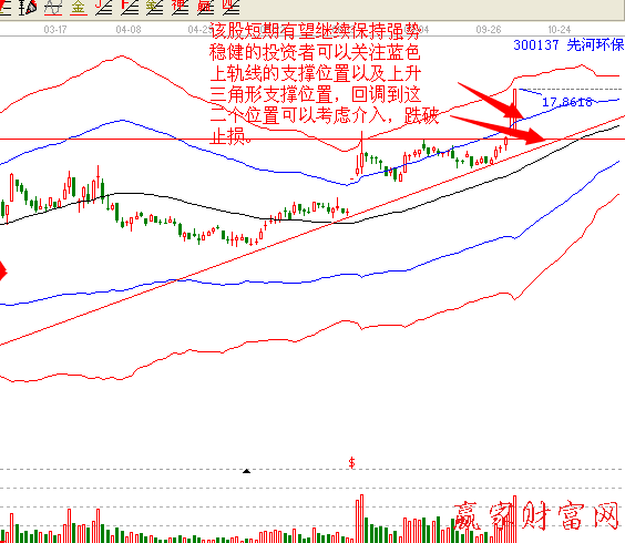 后勢判研:該股近期一直在5日線之上運(yùn)行,周五受到國慶期間全國霧霾的影響突擊漲停,并創(chuàng)下上市以來新高,從江恩軟件極反通道來看該股一舉突破極反通道藍(lán)色上軌線,所謂站上一線看高一線,后勢可繼續(xù)看高。具體研判如下