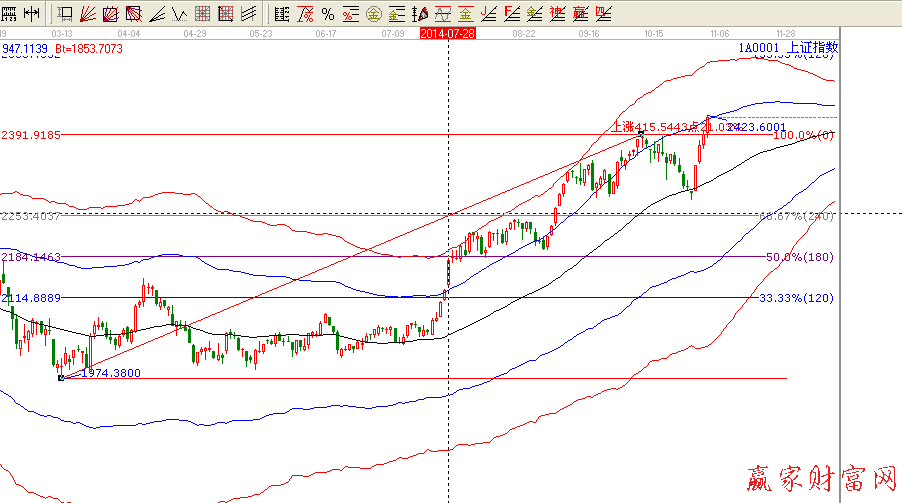 從技術(shù)面來看,滬深兩市股指連拉4連陽(yáng)之后,多頭目前已完全占據(jù)主導(dǎo)優(yōu)勢(shì),但做多動(dòng)能的迅速釋放恐將透支后市行情,短線股指繼續(xù)大幅上漲的空間或已不大,后市大盤繼續(xù)上攻在2400點(diǎn)關(guān)口附近也有震蕩整理的需求。同時(shí)從江恩極反通道可以看出大盤今日已近運(yùn)行到藍(lán)色中軌線,預(yù)計(jì)下周很可能沖高回落。