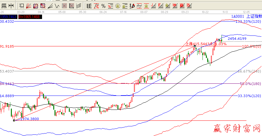 技術(shù)面看,昨日大盤收出帶長下引的倒T字K線,其實已經(jīng)提示了風險,在加上今天大盤盤中無量突破進二年的最高點2444點而今日沖高回弱留下長上引線更是明顯的提示了短期頭部的到來,今日沖高有誘多的嫌疑,而在此下跌則繼續(xù)考驗2400點支撐位的作用,近期調(diào)整仍將繼續(xù),但仍然無法抵擋跨年度行情的走勢。故繼續(xù)介意多看少動,保住勝利的果實。依據(jù)贏家江恩系統(tǒng)極反通道提示,今日突破藍色上軌線沒有成功,可以理解為假突破后市調(diào)整將繼續(xù),調(diào)整先看2400點和2319點的支撐。