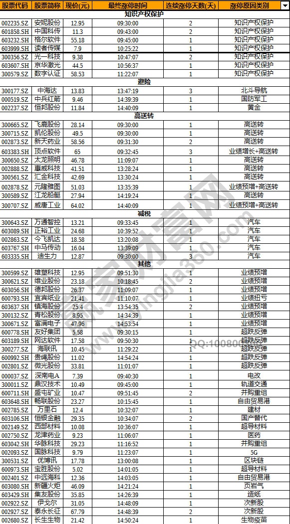 盤面上,知識(shí)產(chǎn)權(quán)概念股繼續(xù)大漲,中國科傳(601858)、安妮股份(002235)、數(shù)字認(rèn)證(300579)、光一科技(300356)漲停。上海自由貿(mào)易港大漲,暢聯(lián)股份(603648)漲停、上海雅士、上遠(yuǎn)???、上海物貿(mào)(600822)大漲6%。超導(dǎo)研究取得百年來新突破,寶勝股份(600973)、西部材料(002149)漲停,百利電氣(600468)、永鼎股份(600105)分別漲6%、5%。原油大幅收漲布油創(chuàng)三年多新高,中曼石油(603619)大漲逾7%,中國石化、中國石油分別大漲3%、1%。臨近尾盤,軍工股直線拉升,中兵紅箭(000519)、亞星錨鏈(601890)雙雙觸及漲停。